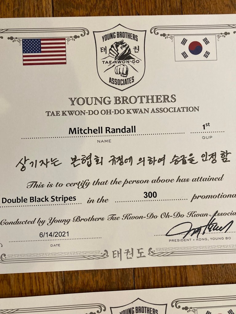 My mentor, Grandmaster Kong, is the highest-ranked master at Young Brothers Taekwondo. He is a 1974 World Champion and a 2007 Taekwondo Hall of Fame inductee. He is also one of the most disciplined guys I have ever met. After 2 years in his program, I have progressed to the triple black stripe.