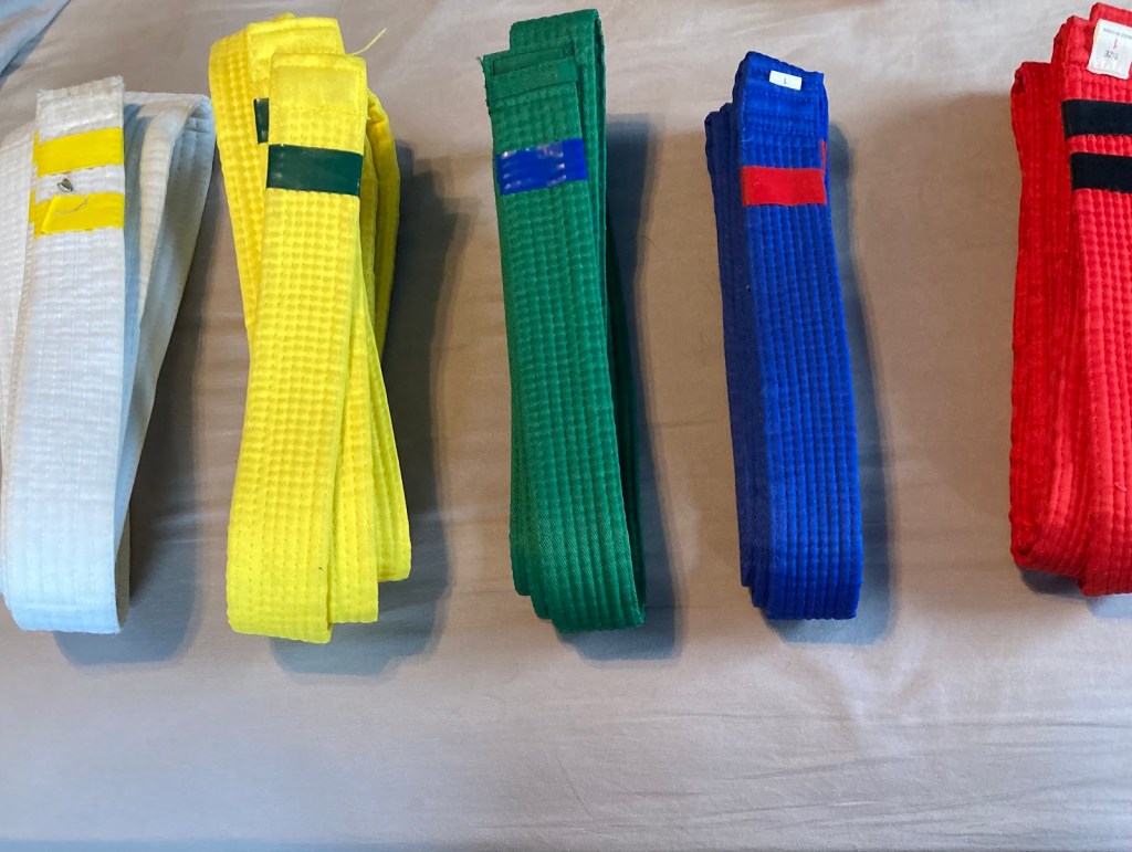 Taekwondo skill levels are ranked by colors. Beginners start with a white belt, and then can earn yellow stripe and yellow belt. This is followed by green stripe and green belt. Those who progress earn blue stripe and blue belt, and then red stripe and red belt.