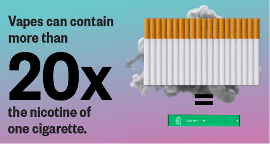 Teens’ brains are still developing, which can make it easier for them to get addicted to nicotine. There could be serious health problems down the line like asthma, lung conditions, organ damage, and heart disorders.